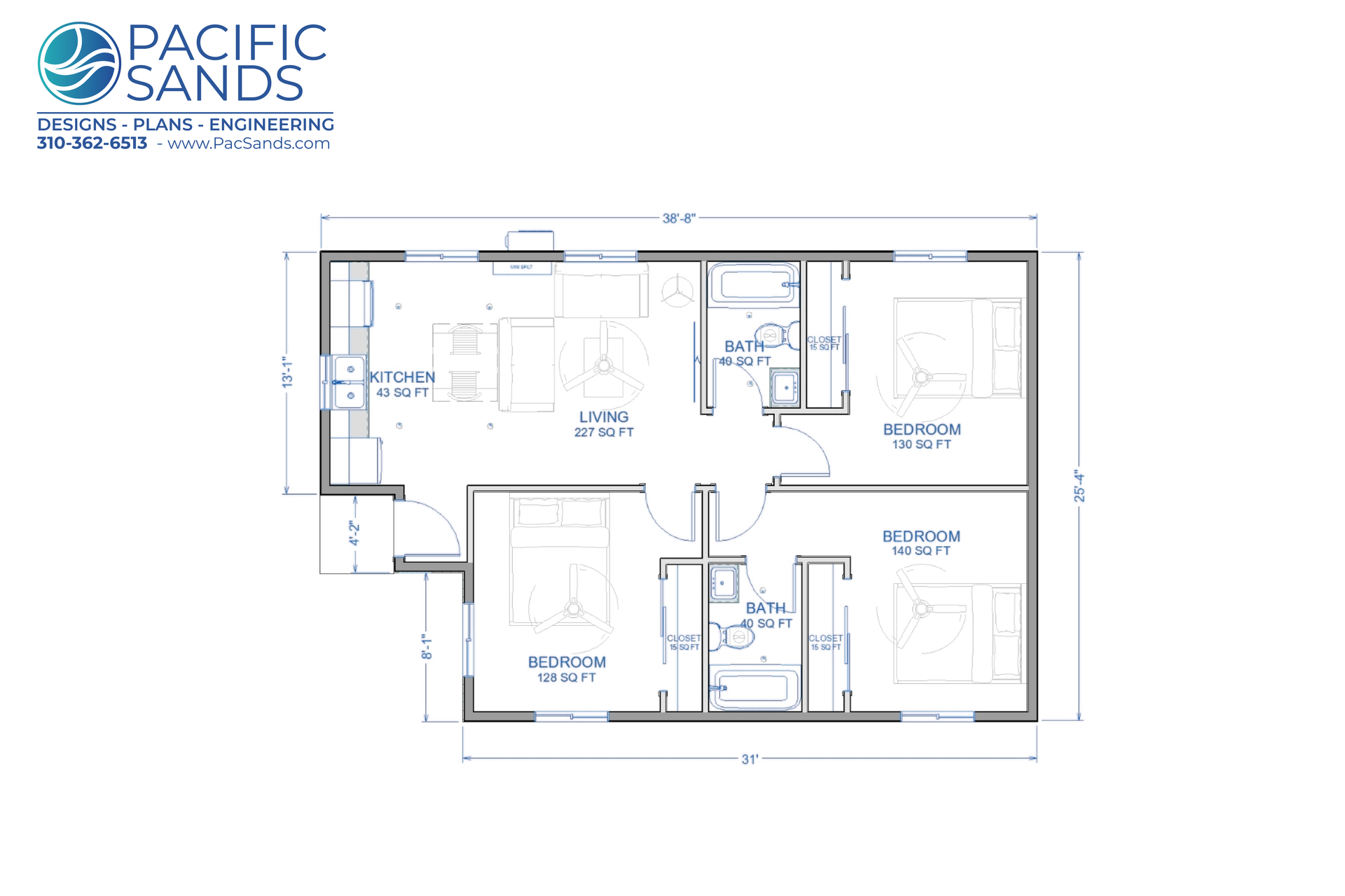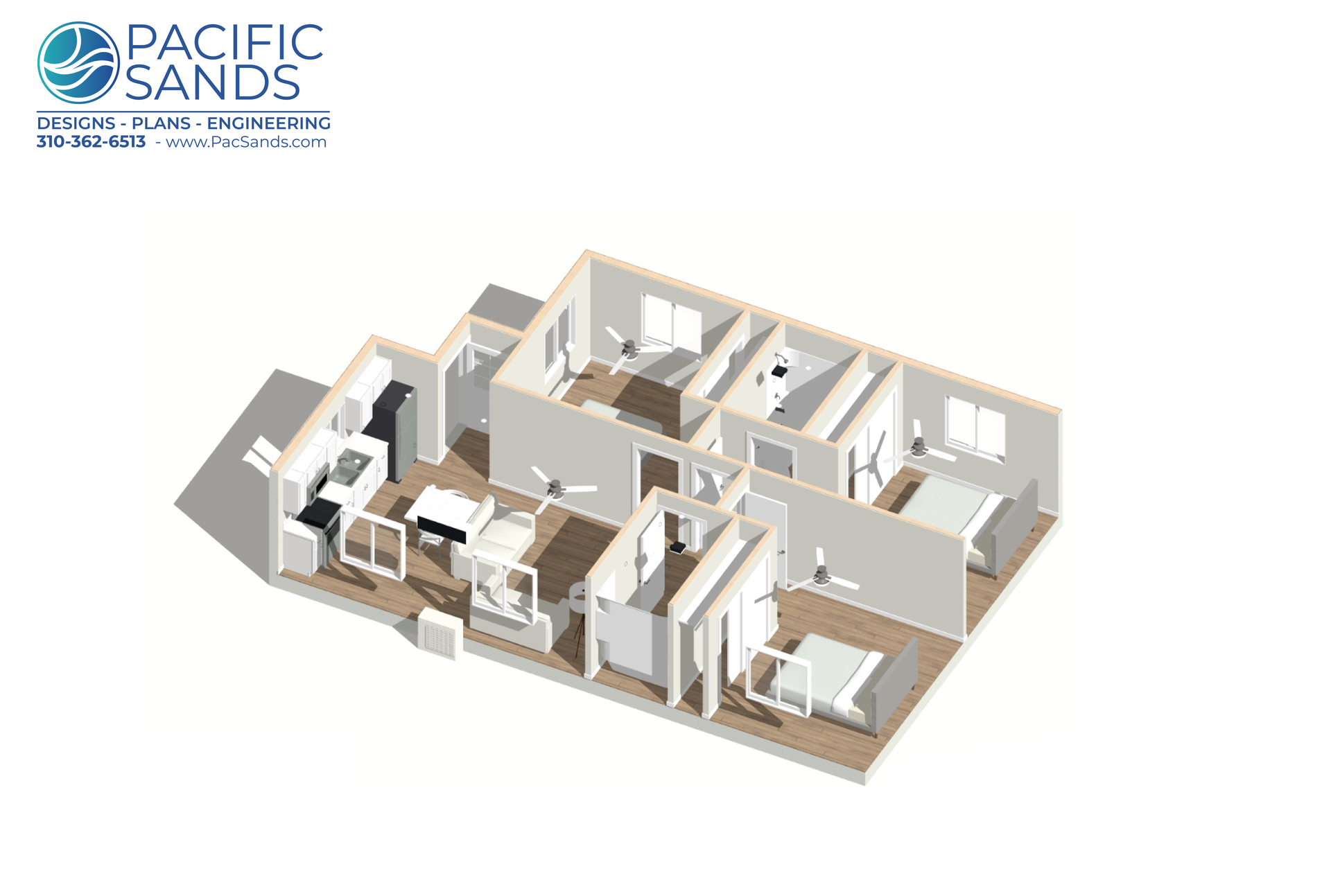 At Pacific Sands, we design ADUs that balance comfort, efficiency, and flexibility. The BR3-BA2-900 Model is a 900 sq. ft. L-shaped detached ADU that delivers a thoughtful 3 bedroom, 2 bathroom layout in a highly functional footprint.