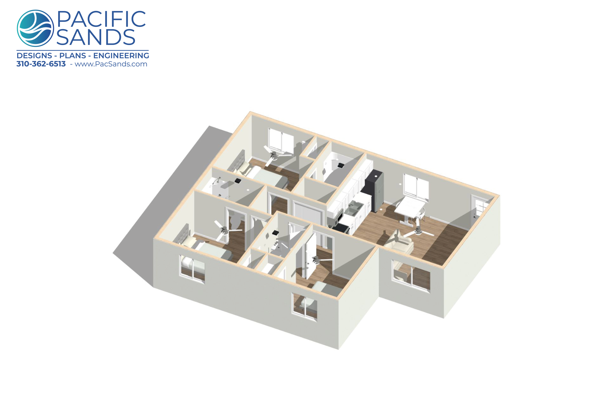 At Pacific Sands, we love designing ADUs that combine modern style, practical layouts, and unique architectural appeal. The BR3-BA3-999 Model is a 999 sq. ft. L-shaped detached ADU that blends open living, smart privacy, and striking design.
